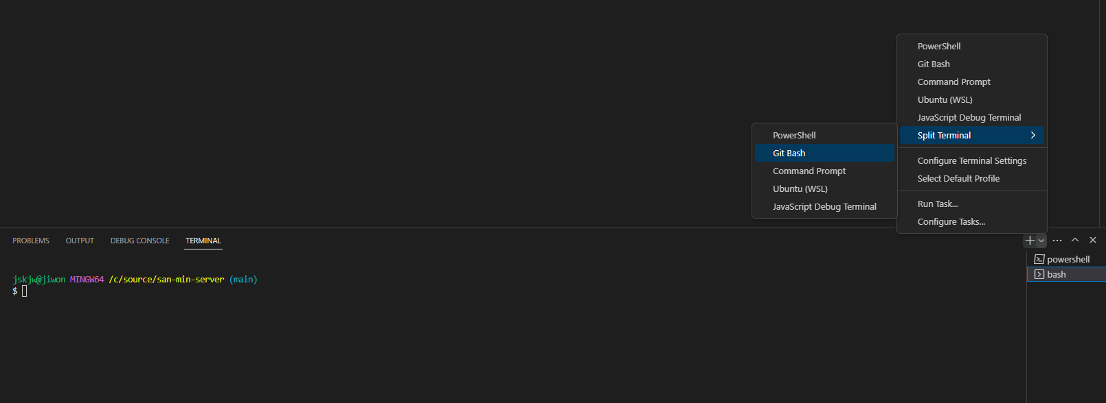 - 이제 새 터미널을 열면 기본 터미널로 git bash가 실행됩니다.